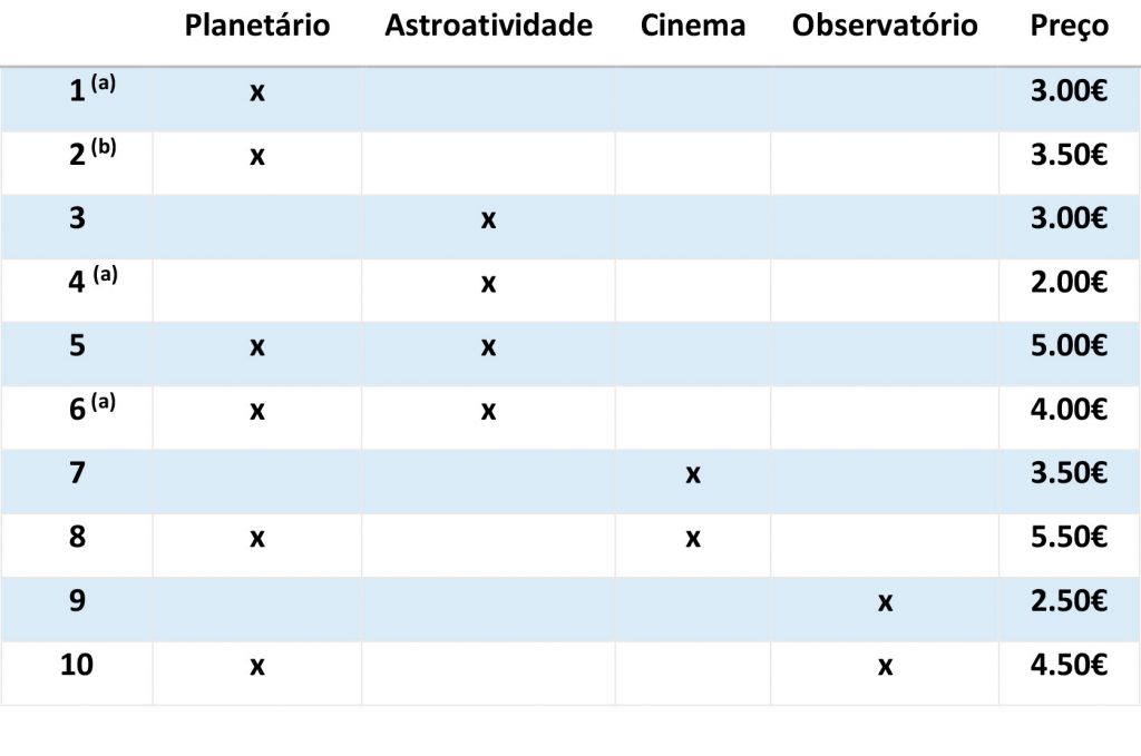 Os preços na tabela seguinte incluem o custo para atividades individuais e em packs de atividades conjuntas. Para o nível de ensino Pré-escolar, há atividades cujo custo é mais baixo do que para os demais níveis.
