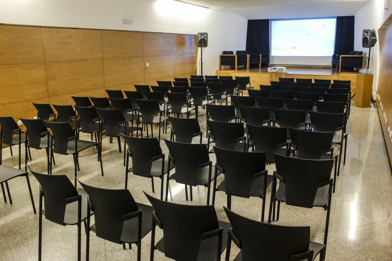 Espaço bastante versátil, que permite a realização de conferências, colóquios, reuniões, pequenos concertos e projeção de filmes. Dotada de excelente acústica e iluminação, funciona como espaço individual ou como complemento a outros espaços existentes no Centro Multimeios. Zona de fácil acesso, é contígua à galeria de exposições e às zonas de convívio, como o Foyer e o Bar, o que permite aumentar as características da sua polivalência. Situada no piso -1. Lotação – Área de 107 m2 – 6m (L) x 14m (PF) | Palco 6m (L) x 3,8m(PF) – 80 lugares sentados (plateia) – 25 lugares sentados (mesas de trabalho) Equipamento – Sistema de projeção e som – Microfones (mesa e volantes) – Tela – Palco – Mobiliário (mesas, cadeiras, sofás, púlpito) – Internet WI-FI e por cabo – Energia: Tomadas monofásicas