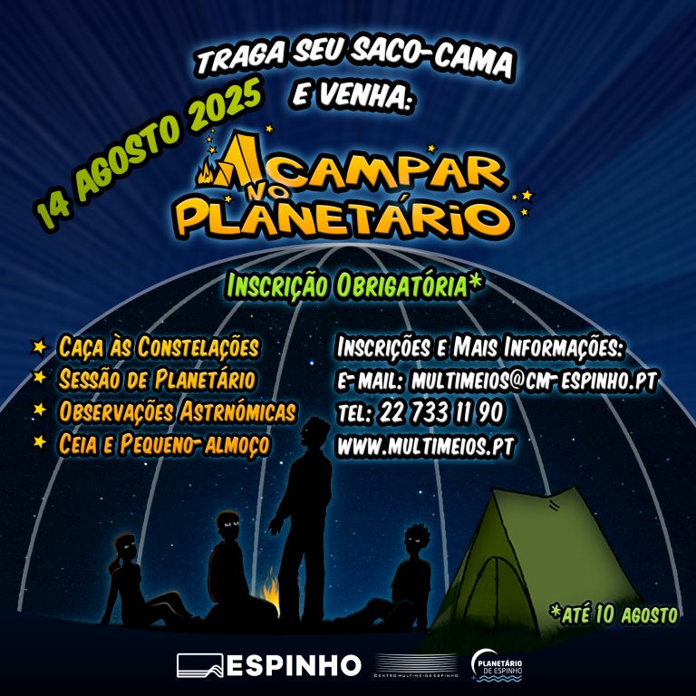 Venha passar uma noite no Planetário do Centro Multimeios de Espinho, onde terá várias atividades, desde Sessões de Observação com telescópios, passando por jogos para descobrir constelações e ainda sessão de Planetário.